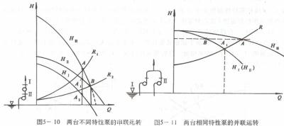 图5—9中HI(HII)是单台泵的特性曲线。HIII是两台泵串联工作时的合成特性曲线,它是在同一流量下两泵相应扬程(纵座标)相加得到的。R是装置特性曲线。单台泵运转时工况点为A,两泵串联时工况点为B.由图可知,两台泵串联扬程和流量都增加.其增加程度和装置特性曲线的形状有关,但都小于单独运转时的两倍。