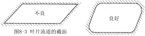 ④流道的水力半径越大越好,尽可能使叶片进口截面接近正方形,以减少摩擦损失,由水力学知道,过水断面面积和湿周的比值叫做水力半径,即水力半径一过水断面面积/湿周。湿周大,实际上就是液体与壁面的接触面积大,当把流道截面从近似正方形变为狭长矩形时,实质上就是让液体在狭长截面的间隙内流过,所以阻力必然大,如图8-3所示。